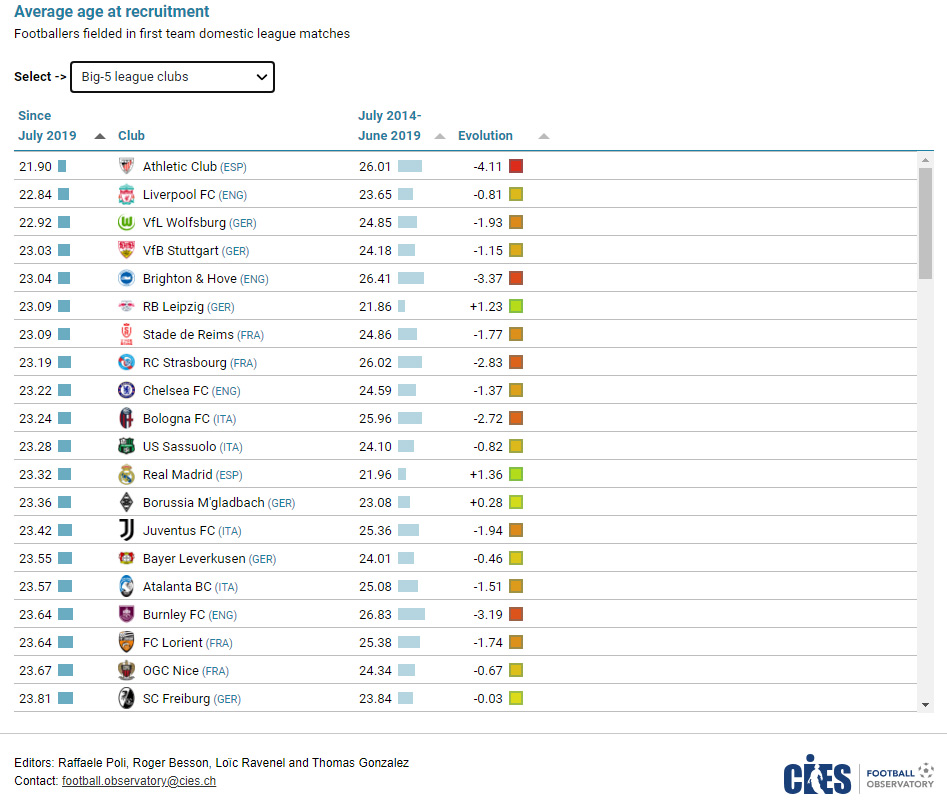 Der Fokus auf gut ausgebildete, junge Spieler macht sich im internationalen Wettbewerb immer mehr bemerkbar. Im Schnitt sind die Kader der Premier League in den vergangenen 20 Jahren um 1,1 Jahre jünger geworden. Die beste Liga der Welt ist damit im Vergleich mit den anderen Topligen aus Deutschland, Italien und Spanien auch die jüngste. Die deutsche Bundesliga hat in den vergangenen zwei Jahrzehnten dabei den größten Sprung gemacht, dort sind die Kader im Schnitt um 1,3 Jahre jünger geworden. Personalentscheidungen beim Rekordmeister FC Bayern München verstärken den Eindruck, dass diese Entwicklung noch lange nicht abgeschlossen ist. Sportdirektor Christoph Freund legt in München seit Beginn seiner Amtszeit einen klaren Fokus auf eine stärkere Integration der Akademie in den Profibetrieb und hat dafür u.a. einen eigenen Talenteförderungs-Koordinator installiert.