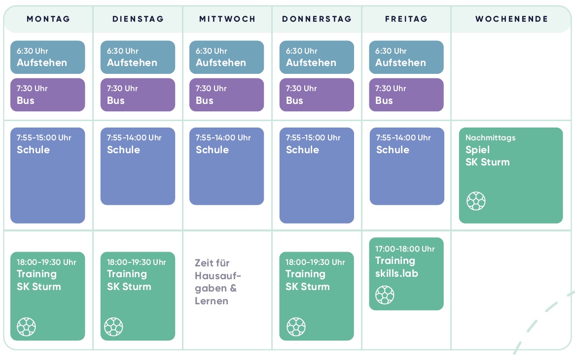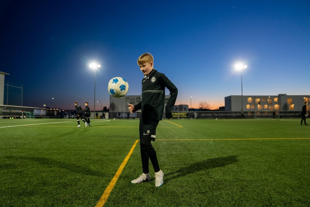 Das Können ist auch anderen nicht verborgen geblieben. Sein Trainer bei JAZ-GU Süd, seinem zweiten Verein, wechselte vor zwei Jahren als Betreuer in den Nachwuchs des SK Sturm – und nahm Tobias gleich mit. Seither sind die Wochen intensiver. Drei Mal die Woche Training, am Wochenende Spiele, dazu zwei Mal pro Woche Nachmittagsunterricht in der Schule. In der skills.lab Arena in Wundschuh arbeitet er zusätzlich weiterhin an seiner Technik und Übersicht. Bei Sturm kommt er als rechter Verteidiger zum Einsatz, noch lieber würde er aber auf dem Flügel spielen. Wie Luis Díaz. „Aber es gefällt mir gut bis jetzt. Die Teamkollegen haben mich gut aufgenommen“, klingt Tobias schon wie ein Profi.