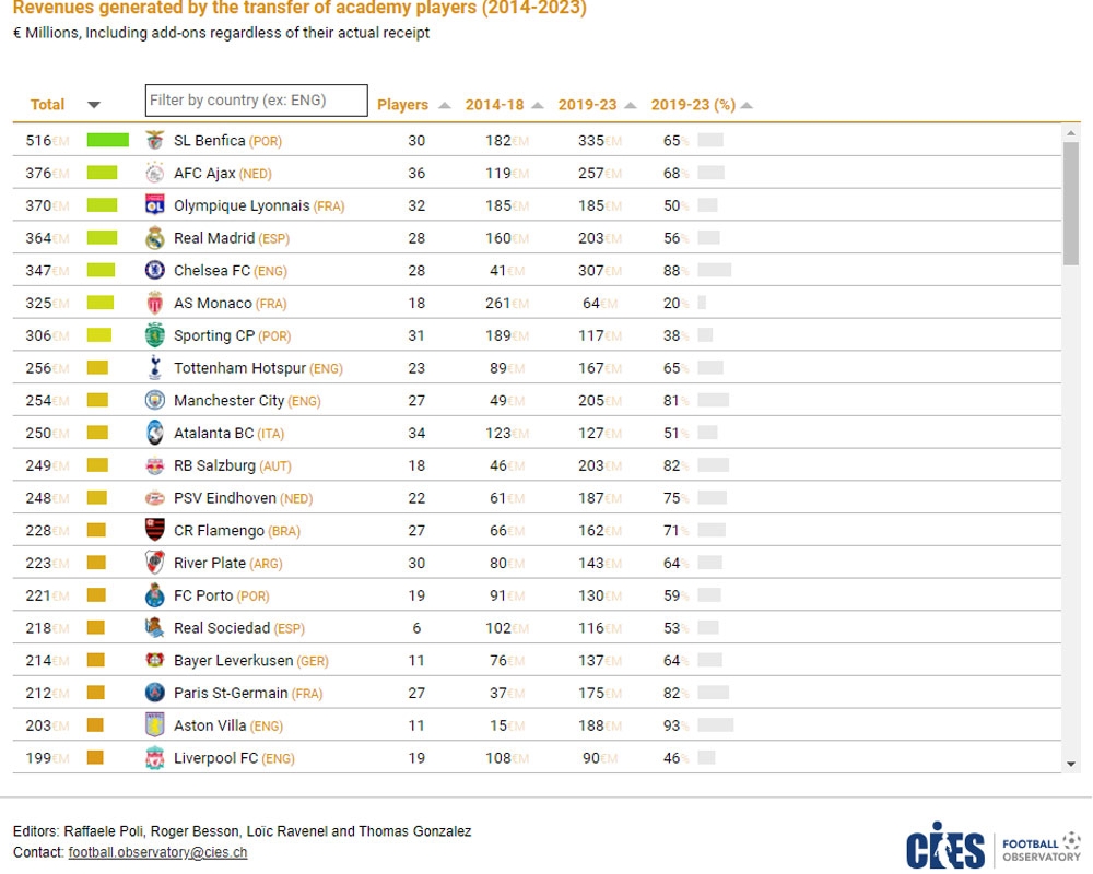 Unangefochtener Spitzenreiter in dieser Wertung ist SL Benfica. Im untersuchten Zeitraum kommt der portugiesische Rekordmeister auf Einnahmen in Höhe von 516 Millionen Euro durch insgesamt 30 Spieler. Alleine in den vergangenen fünf Jahren generierte Benfica 335 Millionen Euro, allen voran durch die Abgänge von Joao Felix zu Atlético und Rúben Dias zum FC Liverpool. Hinter den Portugiesen folgt mit AFC Ajax (376 Mio. Euro) ein weiterer namhafter Klub, der für seine professionelle Ausbildung bekannt ist. Die Top fünf Vereine komplettieren Olympique Lyonnais (370 Mio. Euro), Real Madrid (364 Mio. Euro) und Chelsea (347 Mio. Euro).