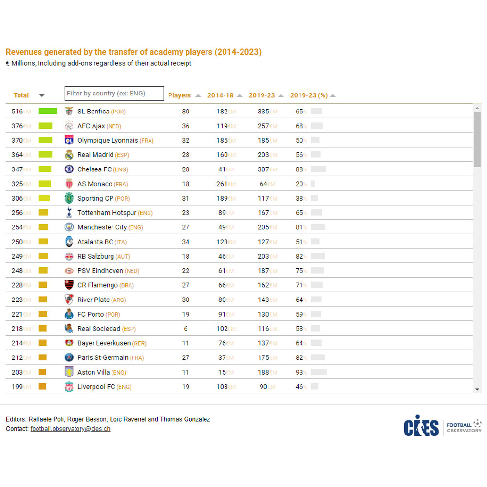 Das CIES Football Observatory untersucht regelmäßig, wie hoch die Rendite für top ausgebildete Talente ist. Die jüngste Studie des Forschungsinstituts vergleicht die 100 Vereine mit den profitabelsten Akademien der Welt. Gemessen wird das an den Einnahmen in den vergangenen zehn Jahren durch den Transfer von Spielern, die mindestens drei Jahre im Alter von 15 bis 21 Jahren von einem Verein ausgebildet worden sind.